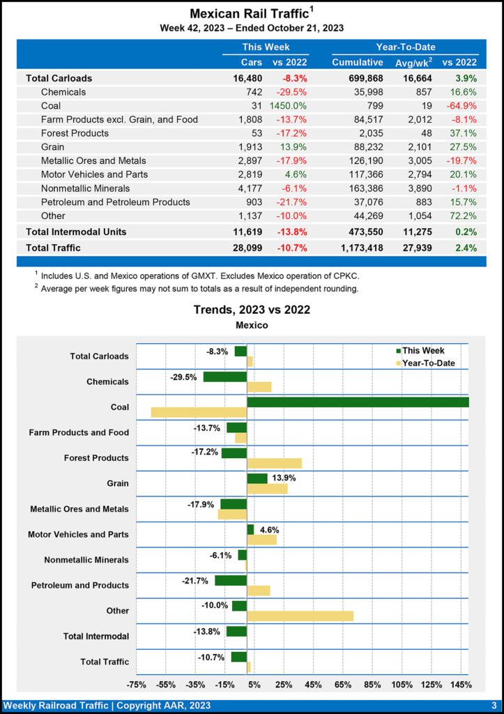 Mexican railroads reported 16,480 carloads for the week ending Oct. 21, 2023, falling 8.3% vs. the prior-year period, and 11,619 intermodal units, dropping 13.8%.