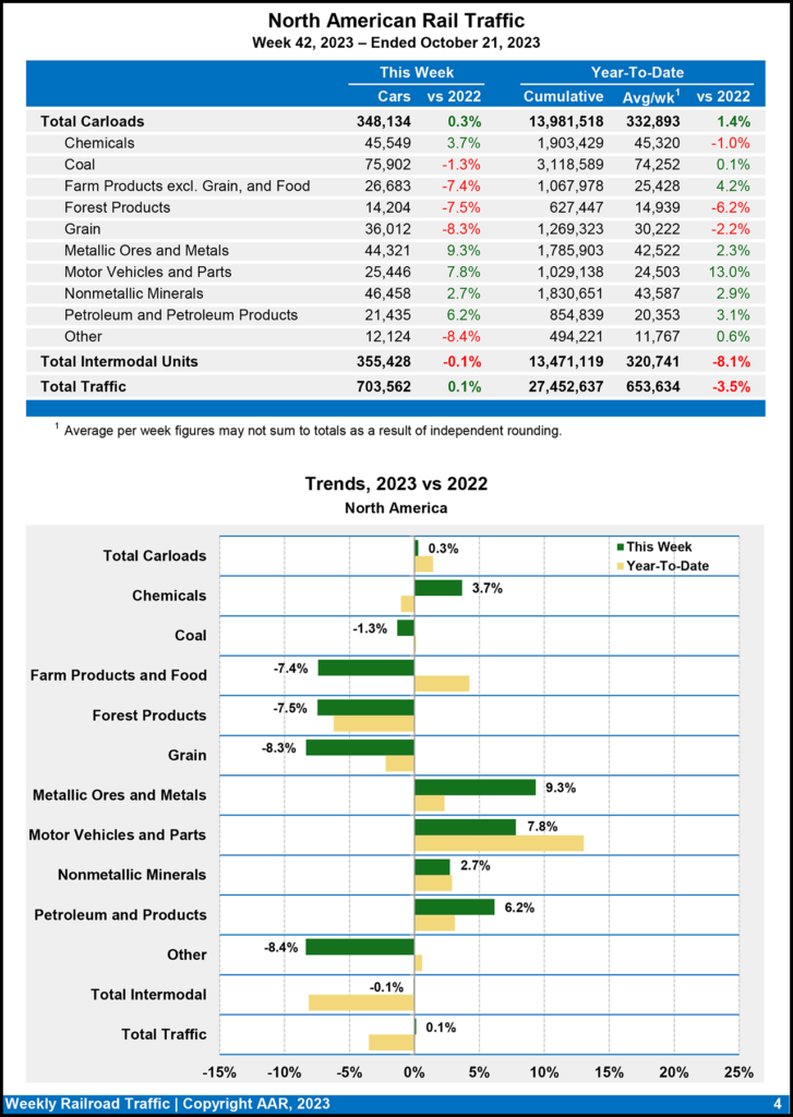 North American rail volume for the week ending Oct. 21, 2023, on 12 reporting U.S., Canadian and Mexican railroads totaled 348,134 carloads, up 0.3% from the prior-year period, and 355,428 intermodal units, down 0.1% from 2022. Total combined weekly rail traffic in North America was 703,562 carloads and intermodal units, up 0.1%.