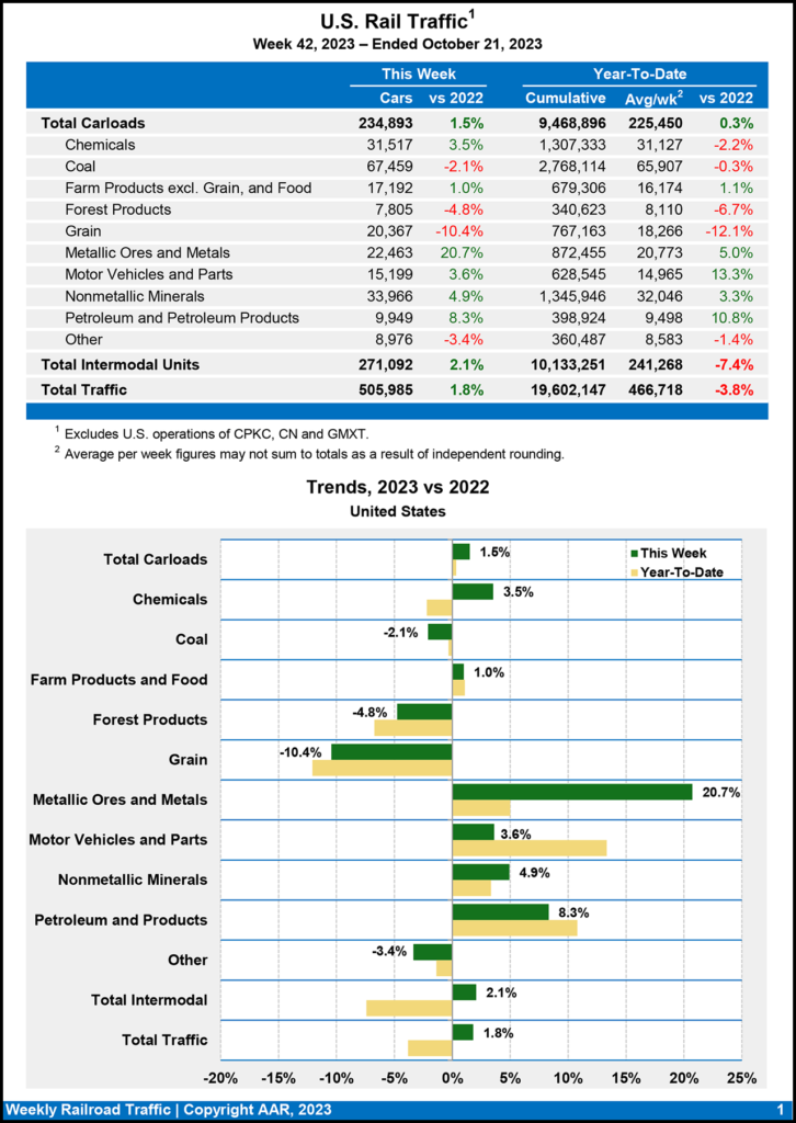 For the week ending Oct. 21, 2023, U.S. Class I railroads moved a total of 505,985 carloads and intermodal units, rising 1.8% from the prior-year period, according to the AAR. This comprises 234,893 carloads—up 1.5% from 2022—and 271,092 containers and trailers—up 2.1% compared with last year.