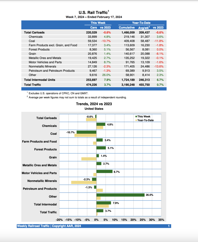 U.S. railroads for the first seven weeks of this year reported cumulative volume of 1,466,059 carloads, decreasing 5.6% from the same point in 2023; and 1,724,189 intermodal units, increasing 6.7% from 2023.
