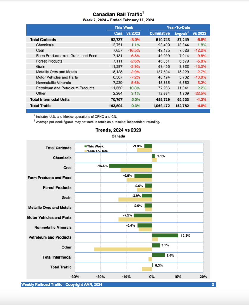 Canadian railroads reported 92,737 carloads for the week ending Feb. 17, 2024, down 3.0%, and 70,767 intermodal units, up 5.0% compared with the same week in 2023.