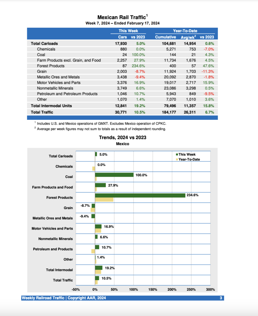 Mexican railroads reported 17,930 carloads for the week ending Feb. 17, 2024, up 5.0% compared with the same week last year, and 12,841 intermodal units, up 19.2%.