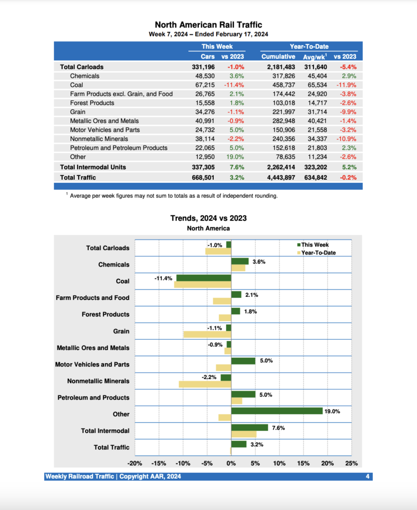 North American rail volume for the week ending February 17, 2024, on 12 reporting U.S., Canadian and Mexican railroads totaled 331,196 carloads, down 1.0% compared with the same week last year, and 337,305 intermodal units, up 7.6% compared with last year. Total combined weekly rail traffic in North America was 668,501 carloads and intermodal units, up 3.2%.