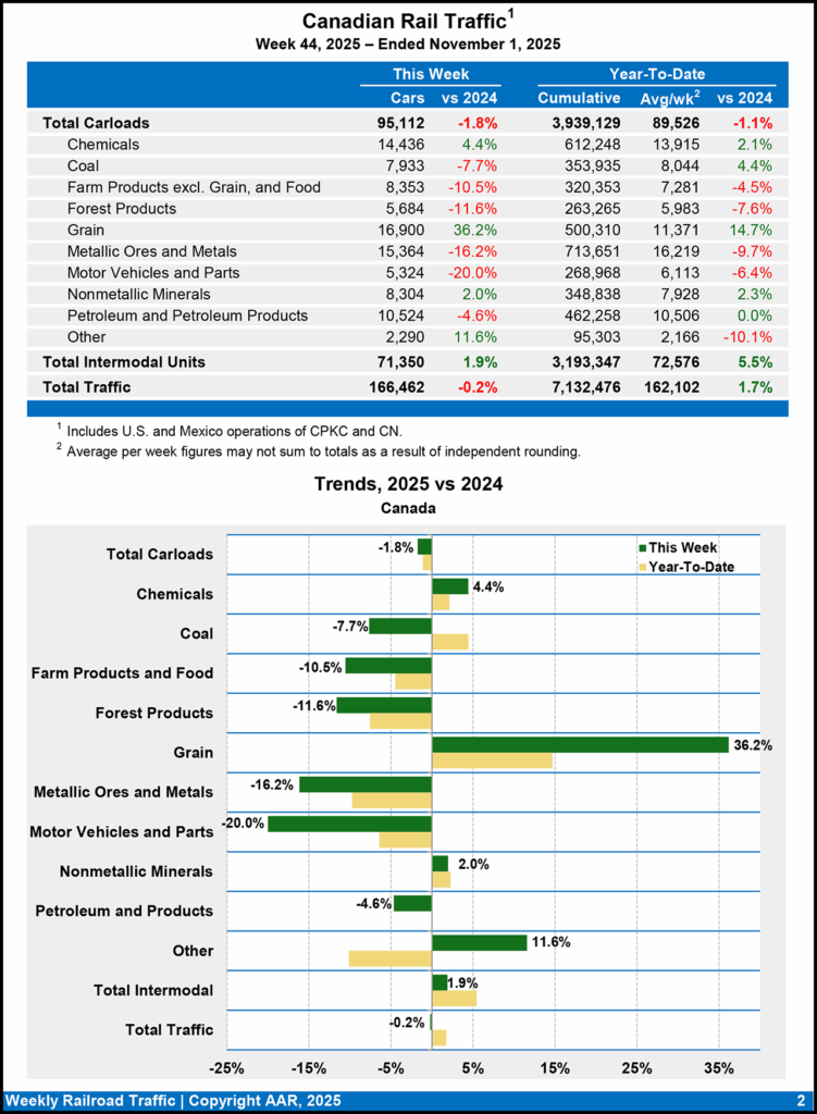 For the week ending Nov. 1, 2025, Canadian railroads reported 95,112 carloads, down 1.8%, and 71,350 intermodal units, up 1.9% from the same week in 2024.