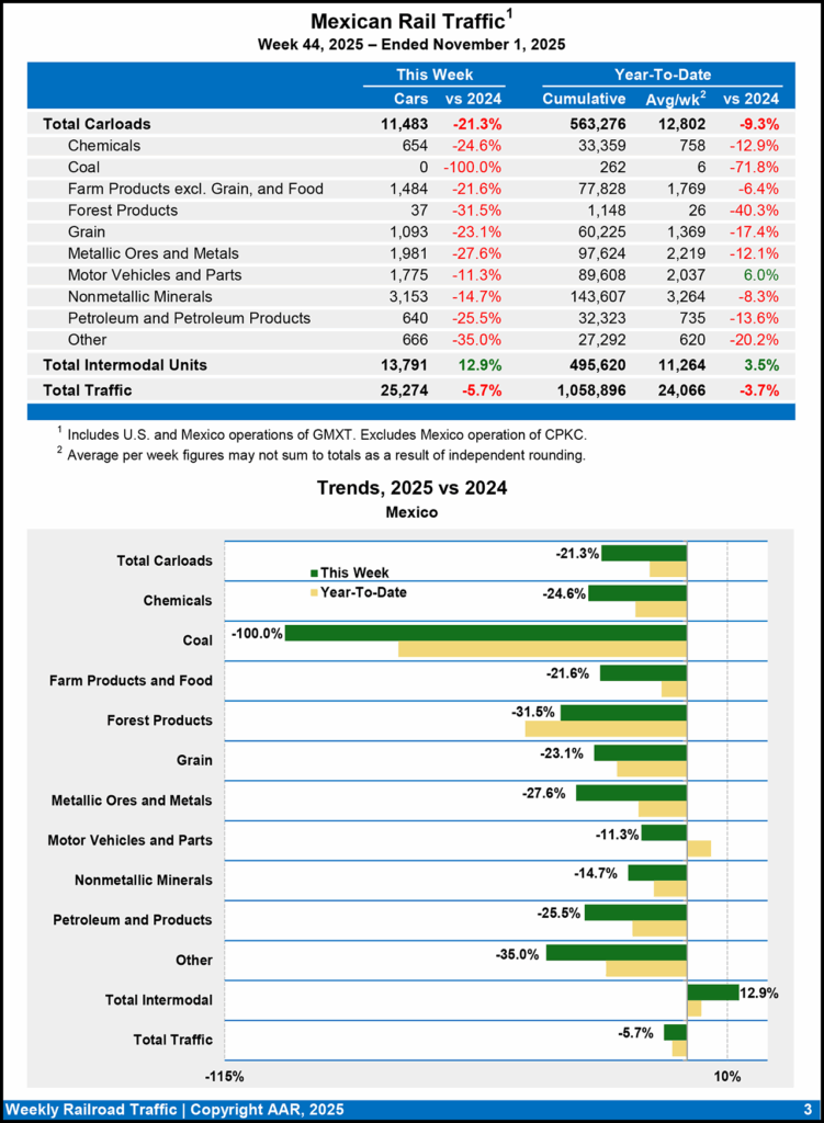Mexican railroads reported 11,483 carloads for the week ending Nov. 1, 2025, dropping 21.3% from the same week last year, and 13,791 intermodal units, increasing 12.9% from last year.