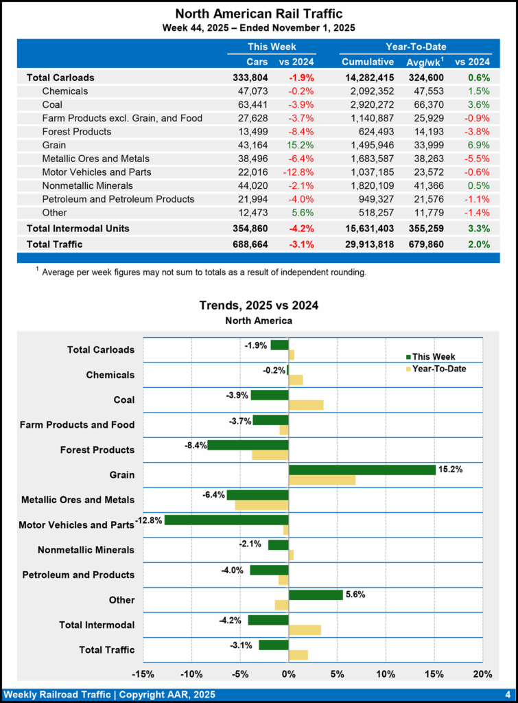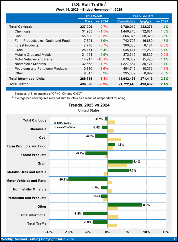 For the first 44 weeks of this year, U.S. railroads reported cumulative volume of 9,780,010 carloads, rising 1.9% from the same period in 2024; and 11,942,436 intermodal units, increasing 2.8% from 2024.
