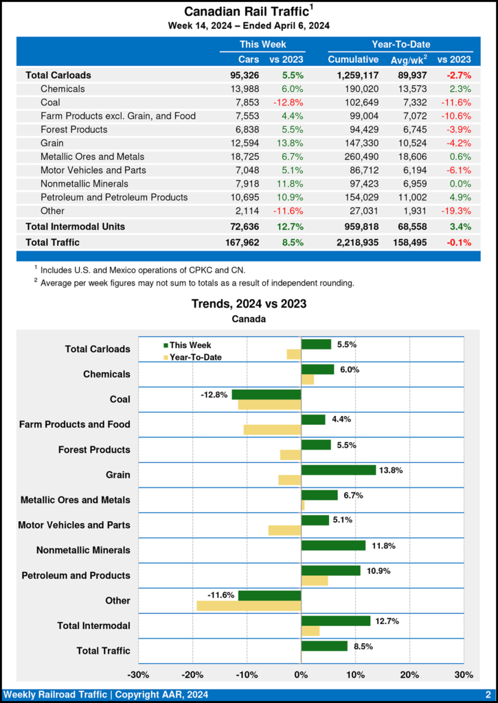 Canadian railroads reported 95,326 carloads for the week ending April 6, 2024, rising 5.5%, and 72,636 intermodal units, increasing 12.7% from the same week last year.