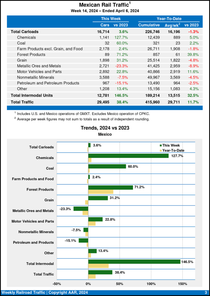 For the week ending April 6, 2024, Mexican railroads reported 16,714 carloads, up 3.6% from the year-earlier period, and 12,781 intermodal units, up 146.5%.