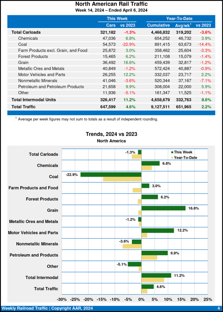 Six of the 10 carload commodity groups posted an increase for the week ending April 6, 2024, vs. the prior-year period. They included grain, up 3,221 carloads, to 22,000; motor vehicles and parts, up 1,983 carloads, to 16,315; and chemicals, up 1,574 carloads, to 31,907. Commodity groups that posted decreases included coal, down 15,107 carloads, to 46,688; nonmetallic minerals, down 2,078 carloads, to 29,540; and metallic ores and metals, down 848 carloads, to 19,403.