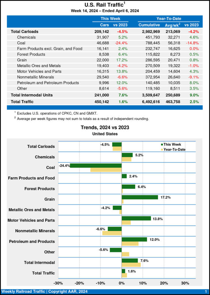 For the week ending April 6, 2024, U.S. Class I railroads hauled a total of 450,142 carloads and intermodal units, increasing 1.6% from the prior-year period, according to the AAR. This comprises 209,142 carloads, down 4.5% from 2023, and 241,000 containers and trailers, up 7.6% compared with 2023.