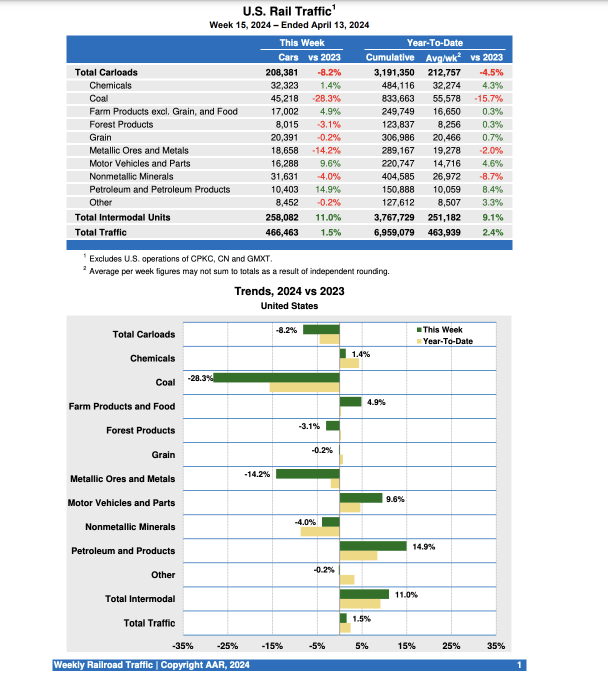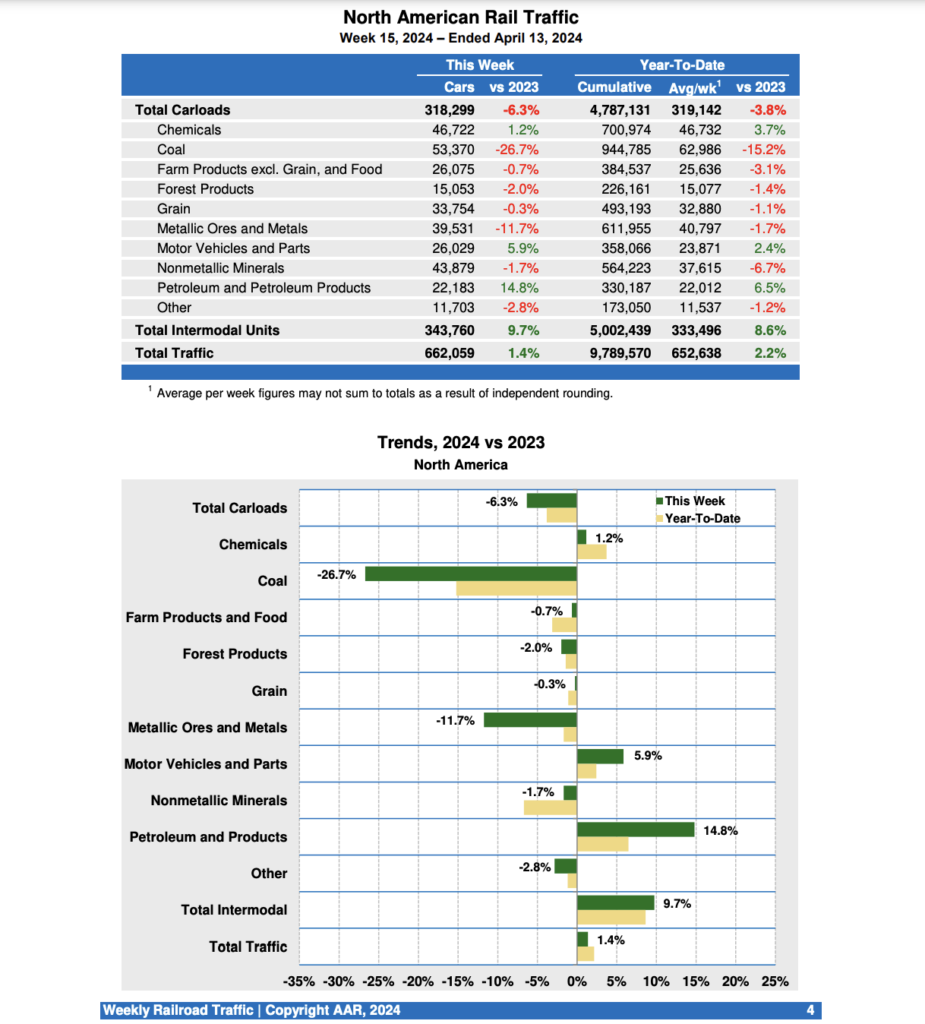 For the first 15 weeks of 2024, U.S. railroads reported cumulative volume of 3,191,350 carloads, down 4.5% from the same period last year; and 3,767,729 intermodal units, up 9.1% from last year.