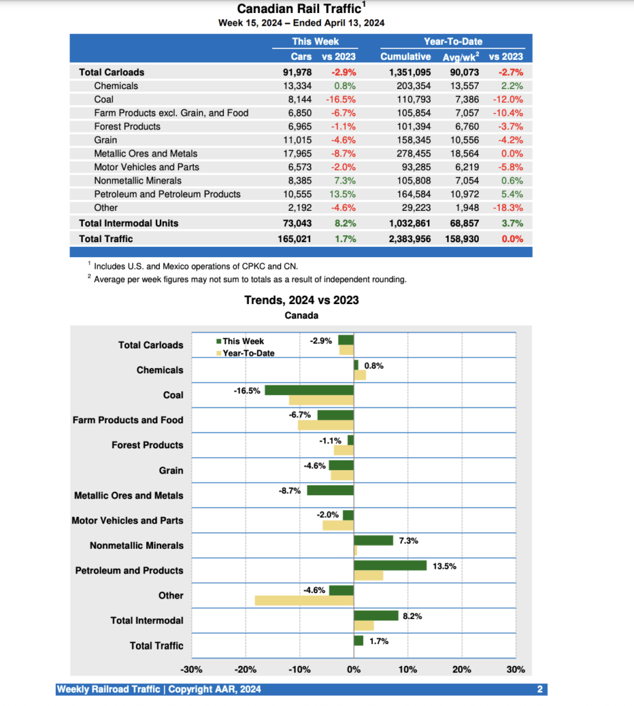 Canadian railroads reported 91,978 carloads for the week, down 2.9%, and 73,043 intermodal units, up 8.2% compared with the same week in 2023.