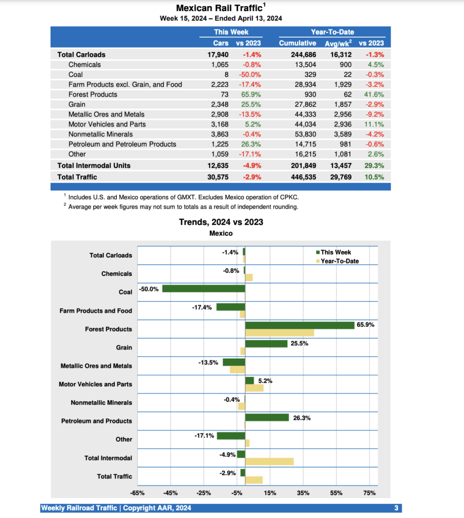Mexican railroads reported 17,940 carloads for the week, down 1.4% compared with the same week last year, and 12,635 intermodal units, down 4.9%.