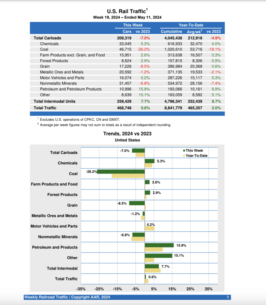 For the week ending May 11, 2024, U.S. Class I railroads moved a total of 468,748 carloads and intermodal units, up 0.6% compared with the same week last year, according to the AAR. This comprises 209,319 carloads, down 7.0% from 2023, and 259,429 containers and trailers, up 7.7% compared to 2023.