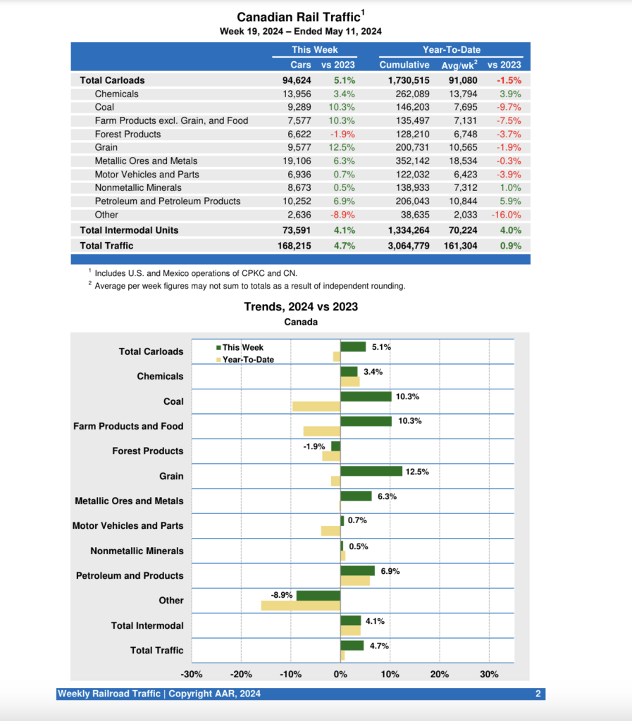 For the week ending May 11, 2024, Canadian railroads reported 94,624 carloads, up 5.1%, and 73,591 intermodal units, up 4.1% compared with the same week in 2023.