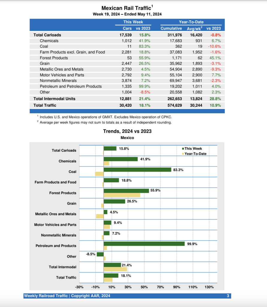 Mexican railroads reported 17,539 carloads for the week ending May 11, 2024, up 15.8% compared with the same week last year, and 12,881 intermodal units, up 21.4%.