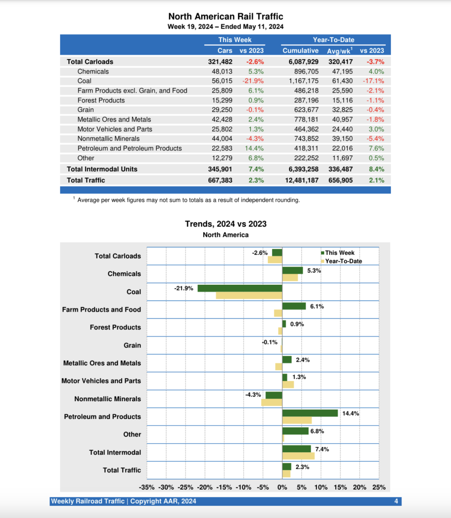 North American rail volume for the week ending May 11, 2024, on 10 reporting U.S., Canadian and Mexican railroads totaled 321,482 carloads, down 2.6% compared with the year-ago period, and 345,901 intermodal units, up 7.4% from last year. Total combined weekly rail traffic in North America was 667,383 carloads and intermodal units, up 2.3%.