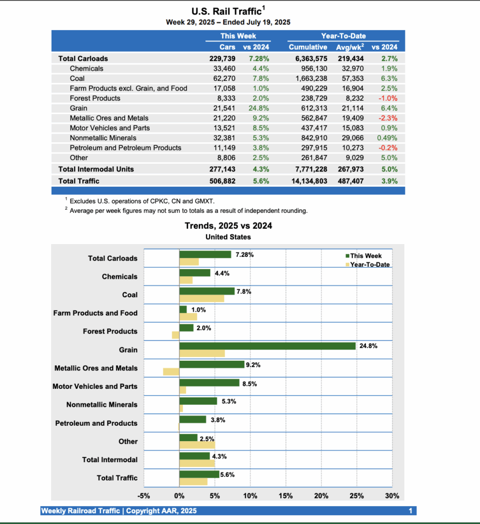 For the week ending July 19, 2025, U.S. Class I railroads carried 506,882 carloads and intermodal units, up 5.6% from the same point last year, according to the AAR. That comprised 229,739 carloads, up 7.3% from 2024, and 277,143 containers and trailers, up 4.3% from 2024.