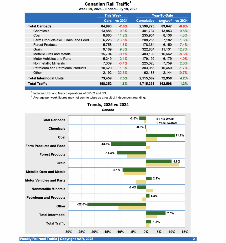 For the week ending July 19, 2025, Canadian railroads reported 84,893 carloads, down 2.6%, and 73,459 intermodal units, up 7.5% compared with the same week last year.