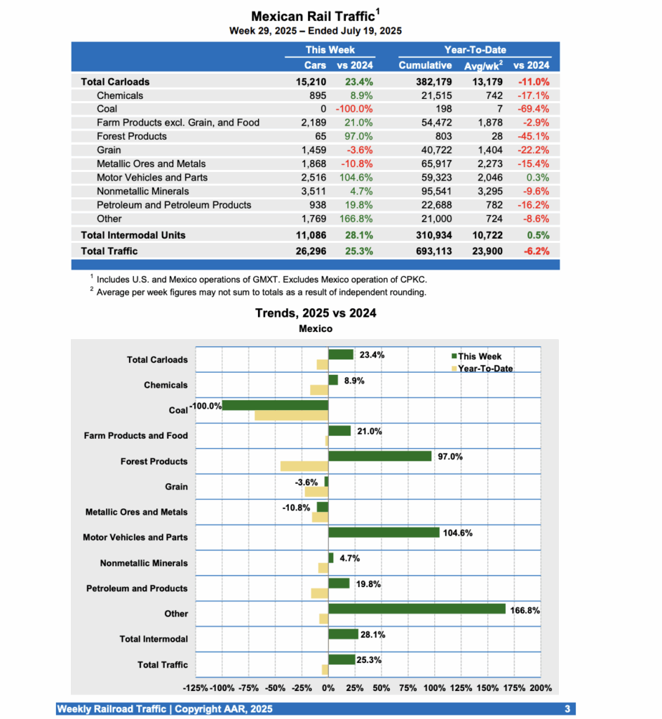 Mexican railroads reported 15,210 carloads for the week ending July 19, 2025, up 23.4% compared with the prior-year period, and 11,086 intermodal units, up 28.1%.