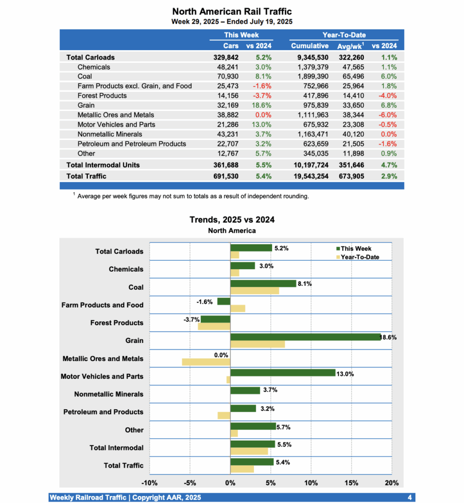 For the first 29 weeks of this year, U.S. railroads reported cumulative volume of 6,363,575 carloads, up 2.7% from the same period in 2024; and 7,771,228 intermodal units, up 5.0% from 2024.