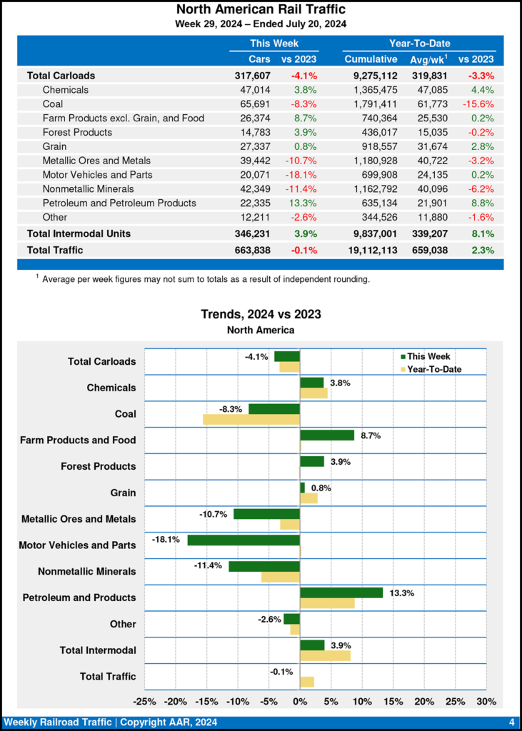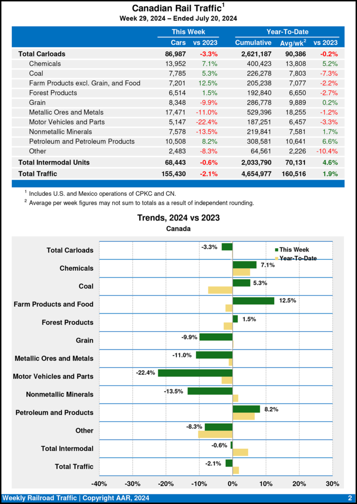 Canadian railroads logged 86,987 carloads for the week ending July 20, 2024, falling 3.3%, and 68,443 intermodal units, decreasing 0.6% compared with year-earlier period.