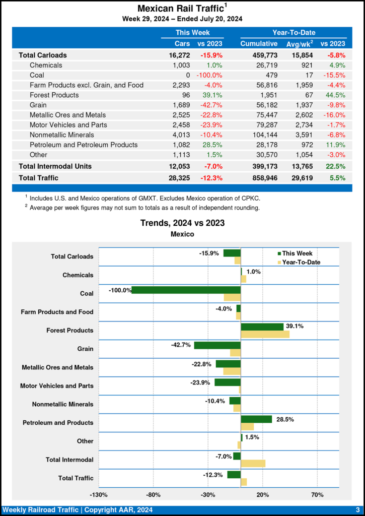 For the week ending July 20, 2024, Mexican railroads reported 16,272 carloads, dropping 15.9% from the same week last year, and 12,053 intermodal units, falling 7.0%.
