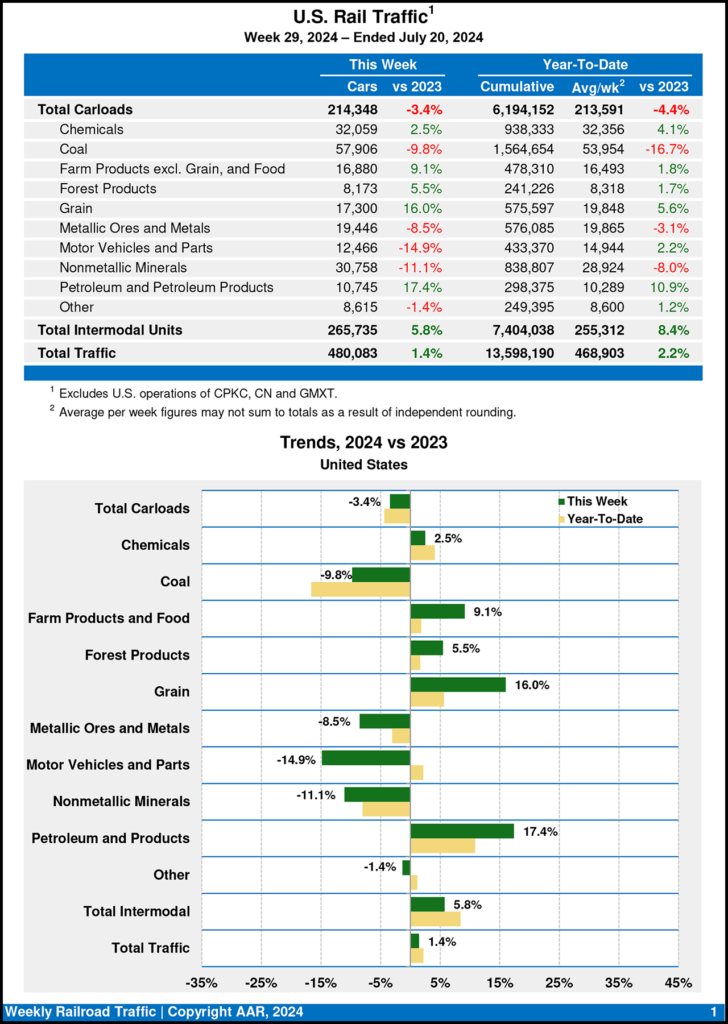 U.S Class I railroads moved a total of 480,083 carloads and intermodal units during the week ending July 20, 2024, a 1.4% increase from the same week last year, according to the AAR. This comprised 214,348 carloads, down 3.4% from 2023, and 265,735 containers and trailers, up 5.8% from 2023. The past two weeks were similar: