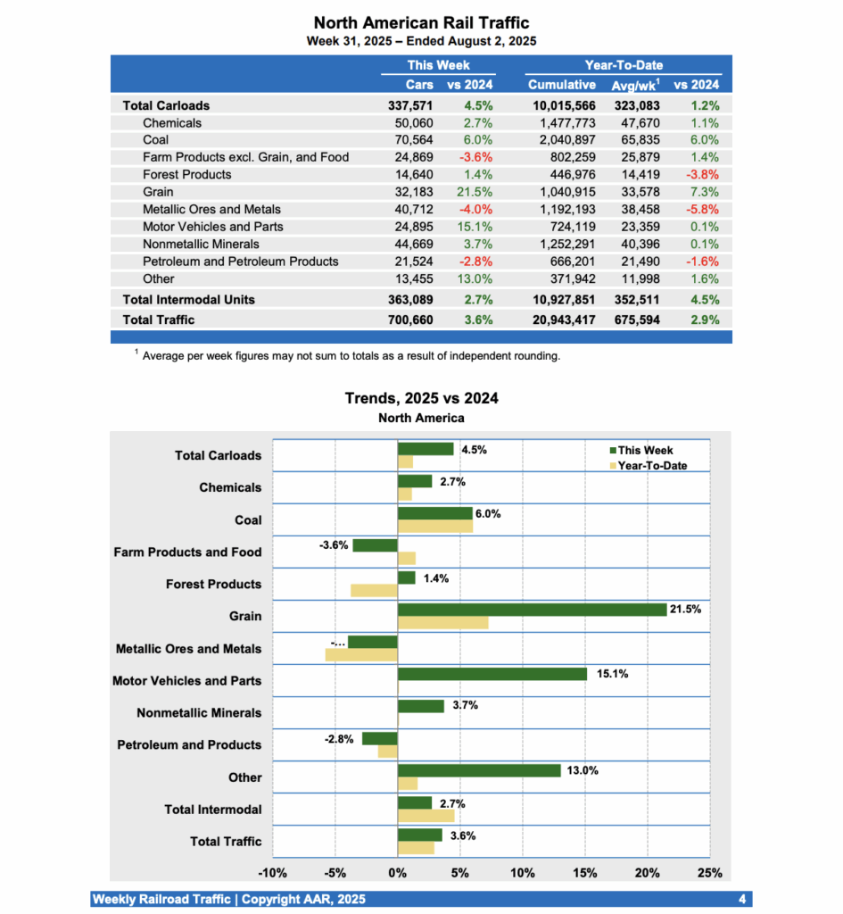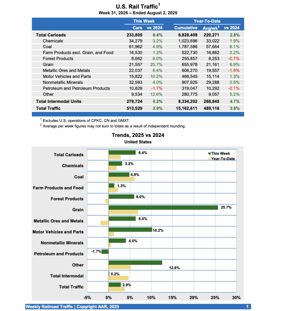 For the first 31 weeks of this year, U.S. railroads reported cumulative volume of 6,828,409 carloads, up 2.8% from the same period in 2024; and 8,334,202 intermodal units, up 4.7% from 2024.