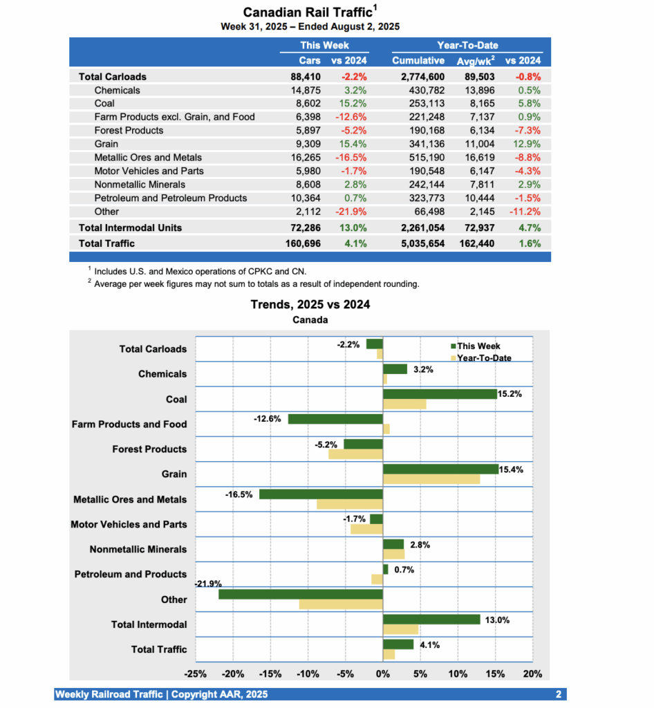 For the week ending Aug. 2, 2025, Canadian railroads reported 88,410 carloads, down 2.2%, and 72,286 intermodal units, up 13.0% compared with the same week last year.