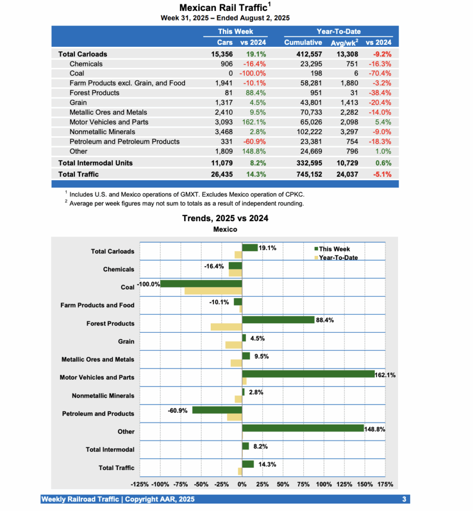 Mexican railroads reported 15,356 carloads for the week ending Aug. 2, 2025, up 19.1% compared with the prior-year period, and 11,079 intermodal units, up 8.2%.