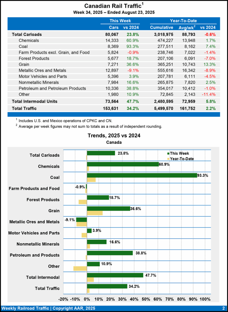 Canadian railroads reported 80,067 carloads for the week ending Aug. 23, 2025, a gain of 23.8%, and 73,564 intermodal units, a gain of 47.7% over the same week last year.