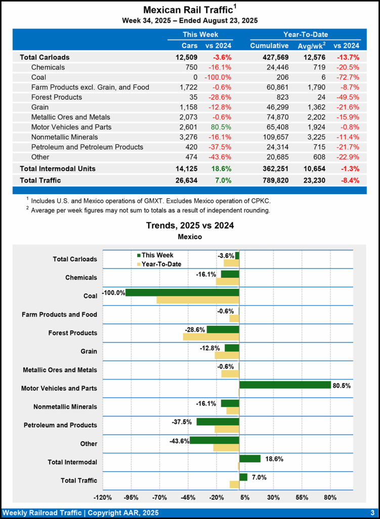 For the week ending Aug. 23, 2025, Mexican railroads reported 12,509 carloads, dipping 3.6% from the same week last year, and 14,125 intermodal units, increasing 18.6%.