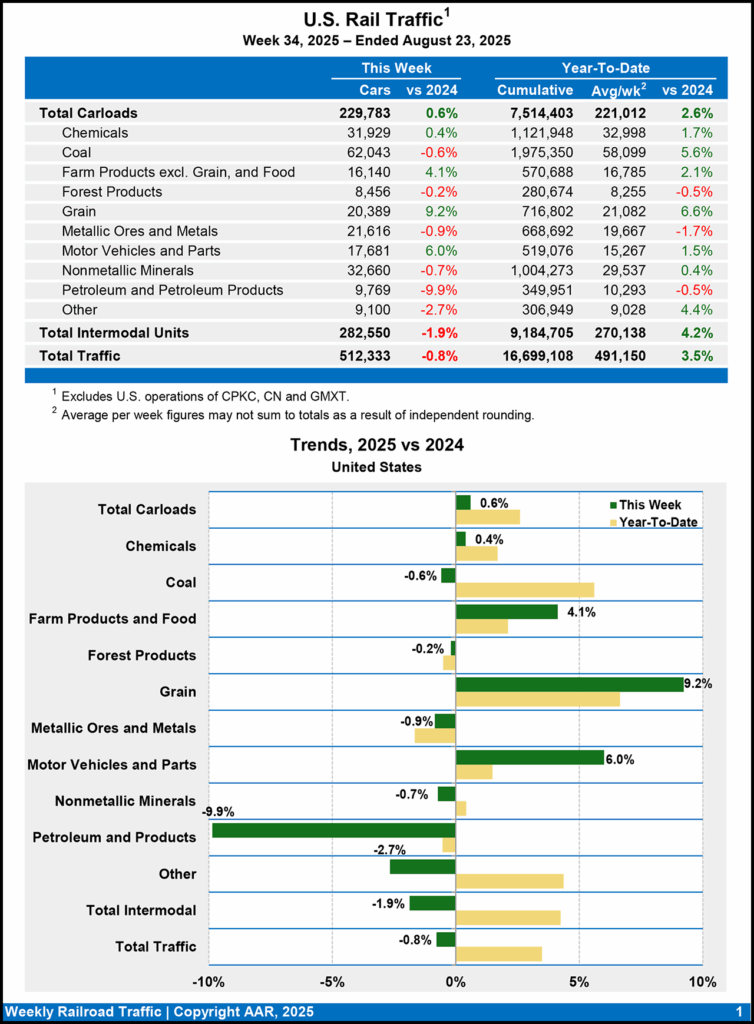 For the week ending Aug. 23, 2025, U.S. Class I railroads carried 512,333 carloads and intermodal units, down 0.8% from the same point last year, according to the AAR. That comprised 229,783 carloads, up 0.6% from 2024, and 282,550 containers and trailers, down 1.9% from 2024.