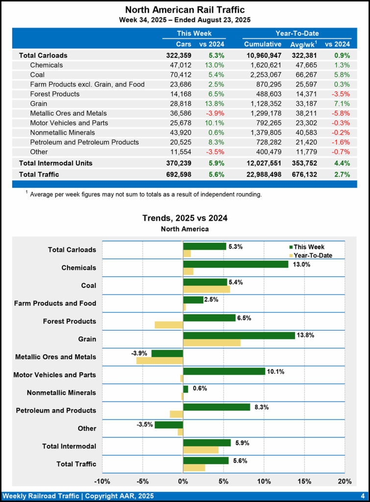 North American rail volume for the week ending Aug. 23, 2025, on nine reporting U.S., Canadian and Mexican railroads totaled 322,359 carloads, up 5.3% compared with the same week last year, and 370,239 intermodal units, up 5.9% compared with last year. Total combined weekly rail traffic in North America came in at 692,598 carloads and intermodal units, rising 5.6%.