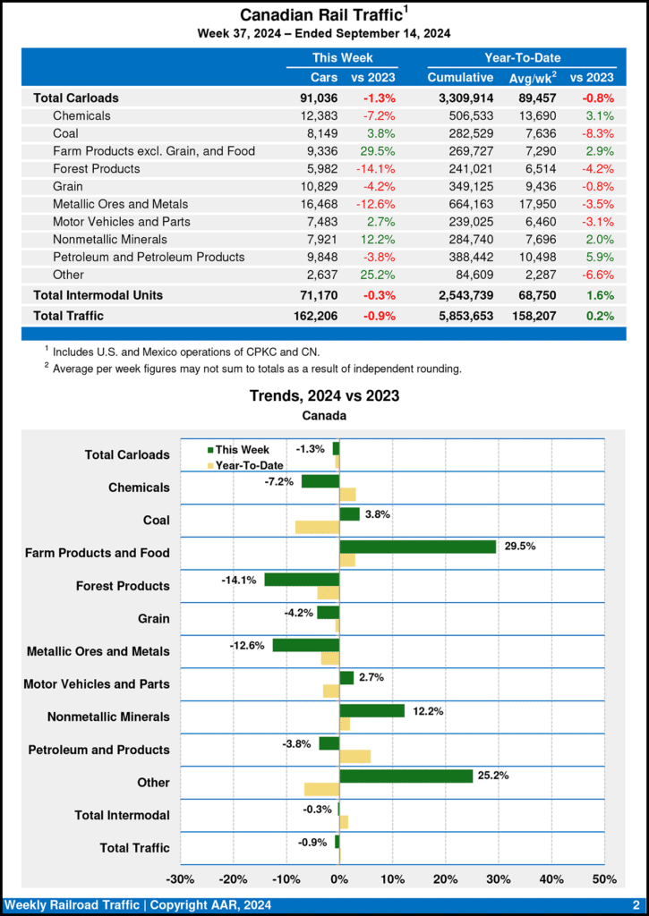 For the week ending Sept. 14, 2024, Canadian railroads reported 91,036 carloads, a 1.3% fall-off, and 71,170 intermodal units, a 0.3% decrease compared with the same week last year.