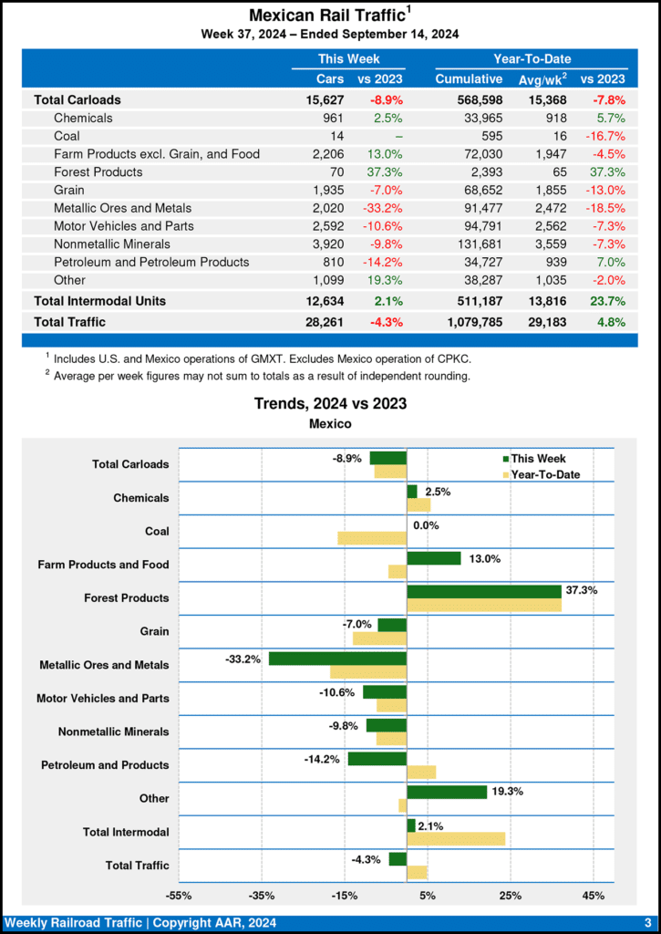 For the week ending Sept. 14, 2024, Mexican railroads reported 15,627 carloads, dropping 8.9% from the year-earlier period, and 12,634 intermodal units, increasing 2.1% from last year.