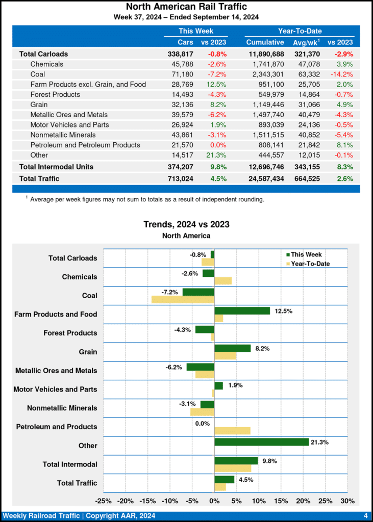 North American rail volume for the week ending Sept. 14, 2024, on nine reporting U.S., Canadian and Mexican railroads totaled 338,817 carloads, down 0.8% from the same week last year, and 374,207 intermodal units, up 9.8% vs. last year. Total combined weekly rail traffic in North America came in at 713,024 carloads and intermodal units, gaining 4.5%.
