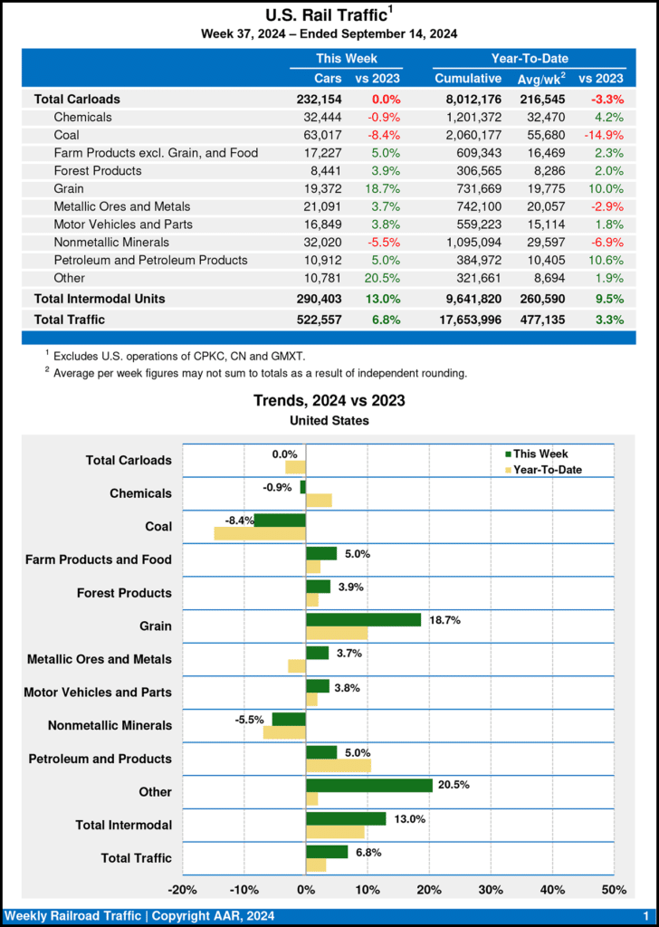 For the first 37 weeks of 2024, U.S. railroads reported cumulative volume of 8,012,176 carloads, dipping 3.3% from the prior-year period; and 9,641,820 intermodal units, increasing 9.5% over last year.