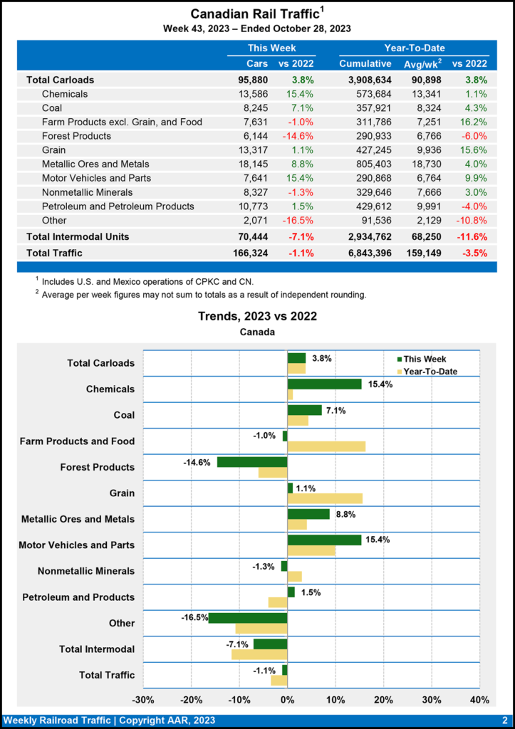 For the week ending Oct. 28, 2023, Canadian railroads reported 95,880 carloads, rising 3.8%, and 70,444 intermodal units, dropping 7.1% from the same week last year. For the first 43 weeks of 2023, they reported cumulative rail traffic volume of 6,843,396 carloads, containers and trailers, down 3.5%.