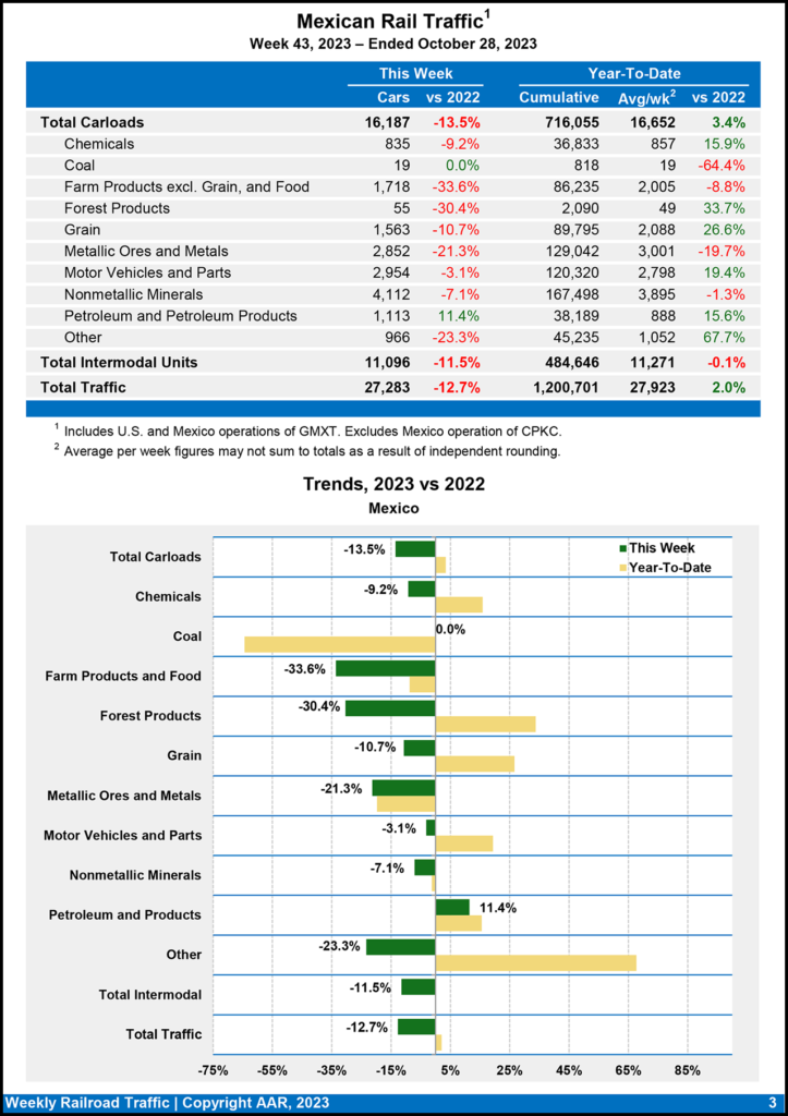 Mexican railroads reported 16,187 carloads for the week ending Oct. 28, 2023, falling 13.5% from the same week last year, and 11,096 intermodal units, decreasing 11.5%. Their cumulative volume for the first 43 weeks of this year was 1,200,701 carloads and intermodal containers and trailers, up 2.0% from the same point in 2022.