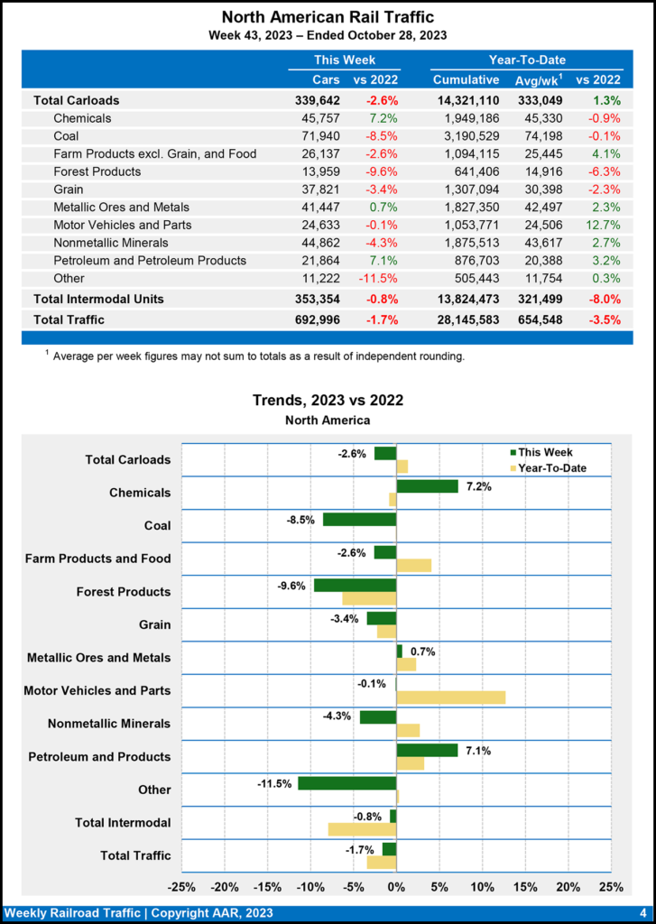 North American rail volume for the week ending Oct. 28, 2023, on 10 reporting U.S., Canadian and Mexican railroads totaled 339,642 carloads, a 2.6% drop-off compared with the same week last year, and 353,354 intermodal units, down 0.8% from last year. Total combined weekly rail traffic in North America came in at 692,996 carloads and intermodal units, down 1.7%. North American rail volume for the first 43 weeks of this year was 28,145,583 carloads and intermodal units, a 3.5% fall-off from 2022.