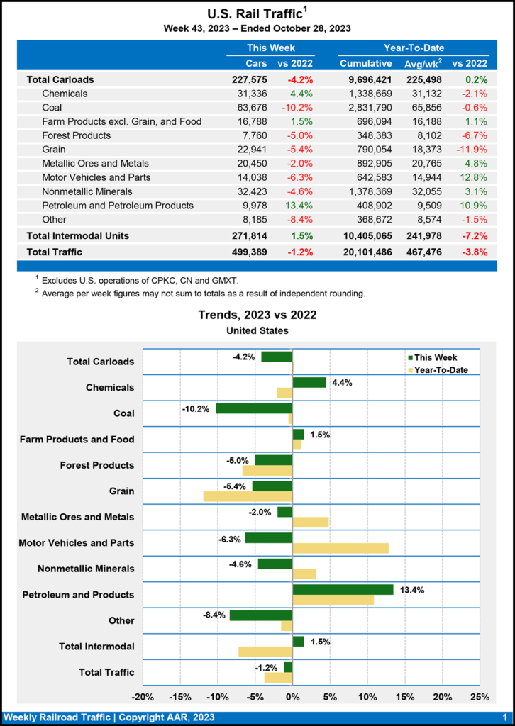 Total combined U.S. traffic for the first 43 weeks of 2023 was 20,101,486 carloads and intermodal units, dipping 3.8% from the same point in 2022.