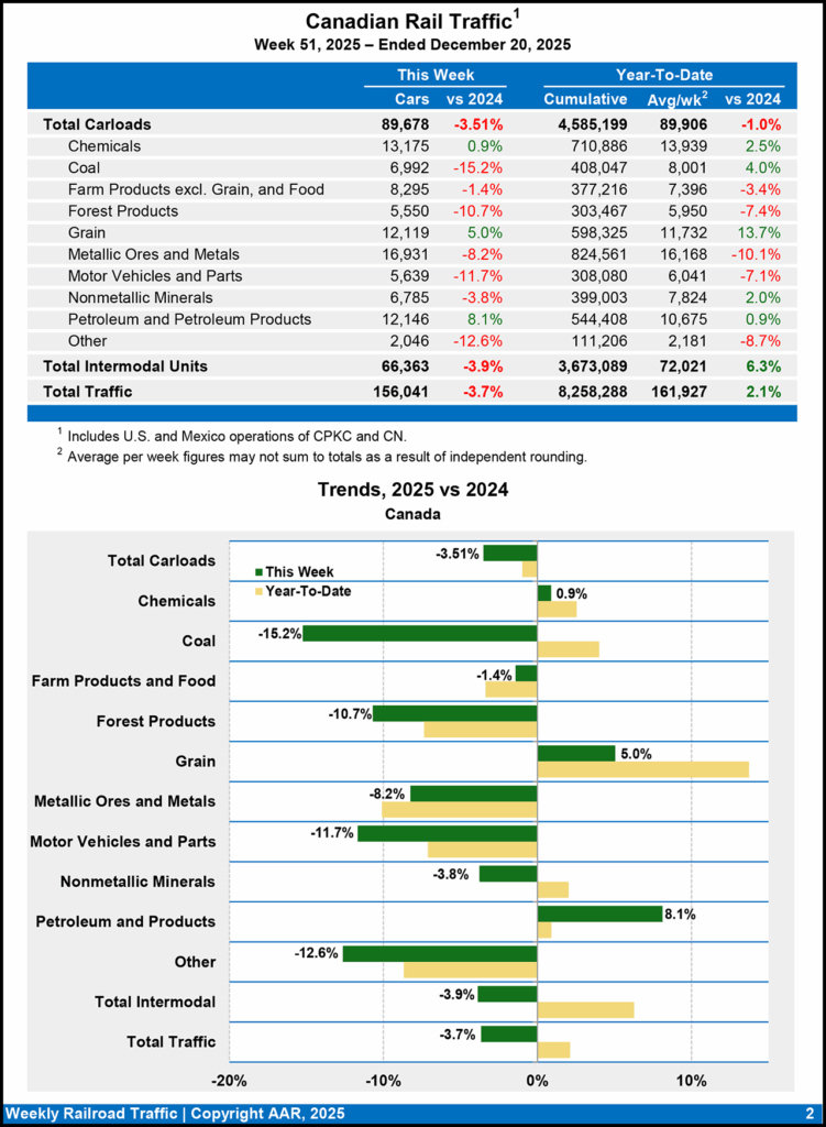 Canadian railroads for the week ending Dec. 20, 2025, reported 89,678 carloads, dipping 3.5%, and 66,363 intermodal units, falling 3.9% from the same point last year. For the first 51 weeks of 2025, they reported cumulative rail traffic volume of 8,258,288 carloads, containers, and trailers, up 2.1%.