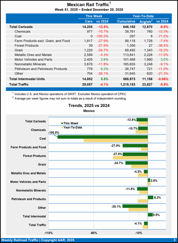 For the week ending Dec. 20, 2025, Mexican railroads reported 14,205 carloads, declining 12.5% from the same week last year, and 14,852 intermodal units, gaining 5.5%. Their cumulative volume for the first 51 weeks of this year came in at 1,215,153 carloads and intermodal containers and trailers, down 5.5% from the year-ago period.