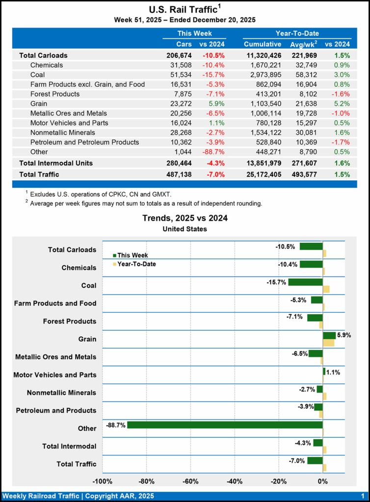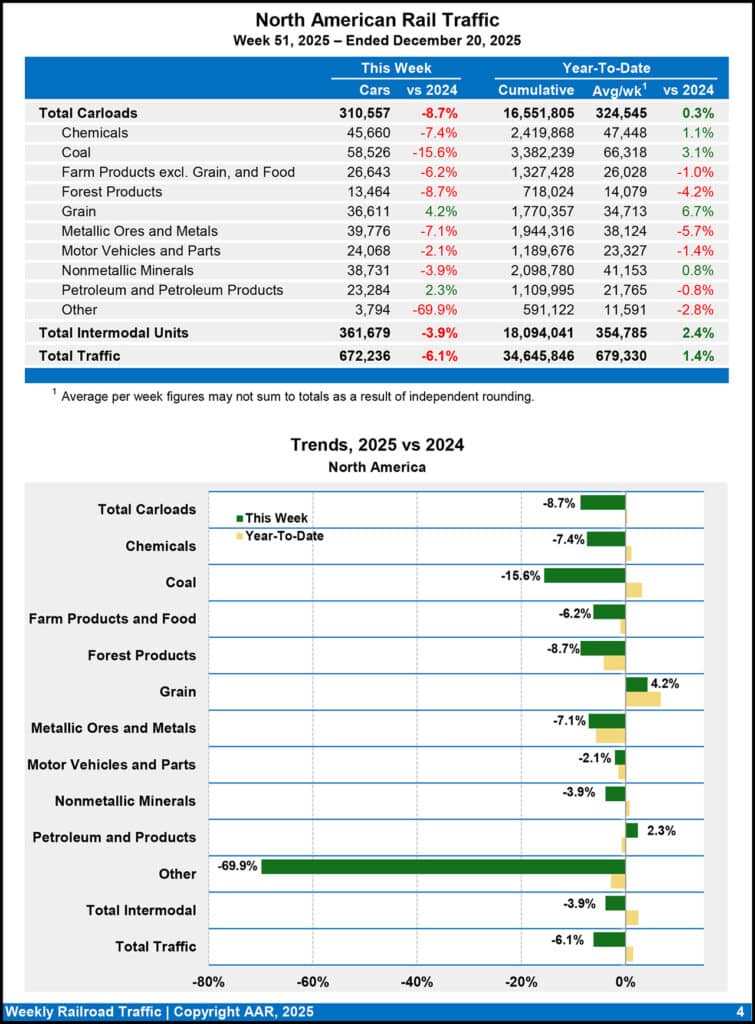 North American rail volume for the week ending Dec. 20, 2025, on nine reporting U.S., Canadian, and Mexican railroads totaled 310,557 carloads, down 8.7% from the same week in 2024, and 361,679 intermodal units, down 3.9% from prior-year period. Total combined weekly rail traffic in North America was 672,236 carloads and intermodal units, a 6.1% decrease. North American rail volume for the first 51 weeks of this year was 34,645,846 carloads and intermodal units, rising 1.4% from 2024.