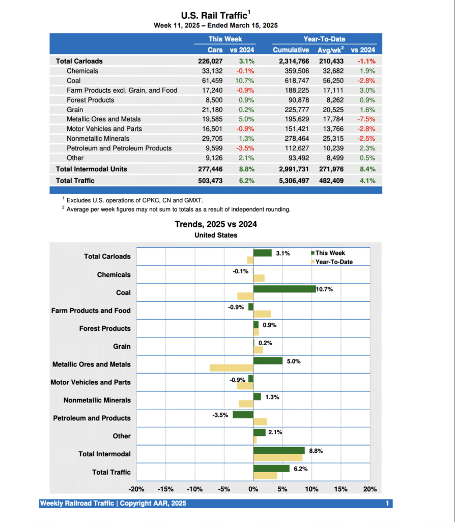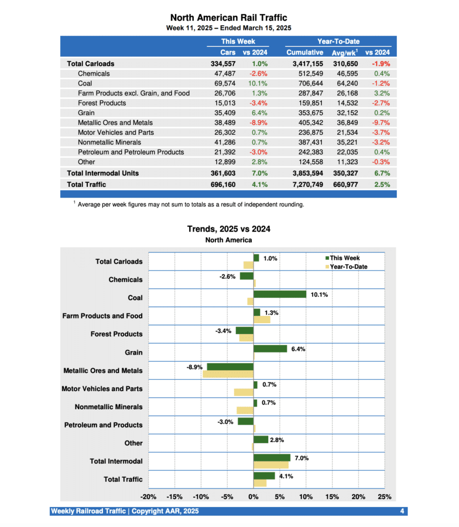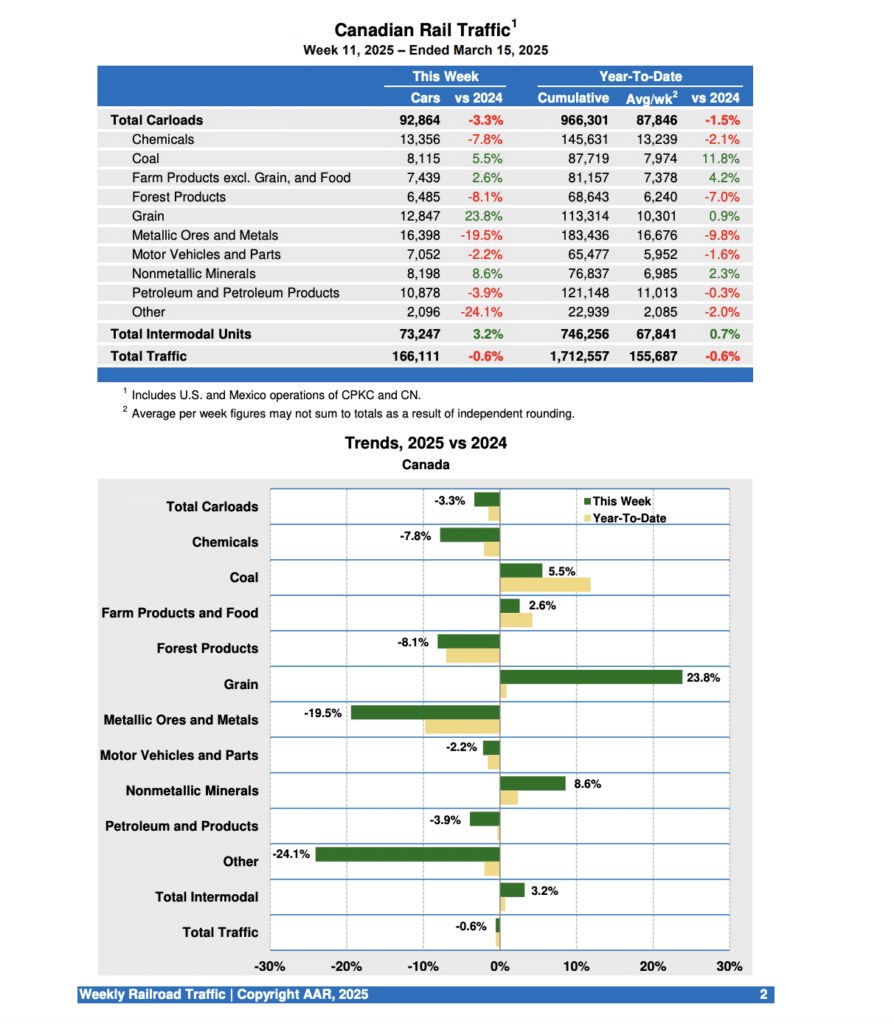 Canadian railroads reported 92,864 carloads for the week ending March 15, 2025, down 3.3%, and 73,247 intermodal units, up 3.2% from the same week last year. For the first 11 weeks of this year, they reported cumulative rail traffic volume of 1,712,557 carloads, containers and trailers, down 0.6%.