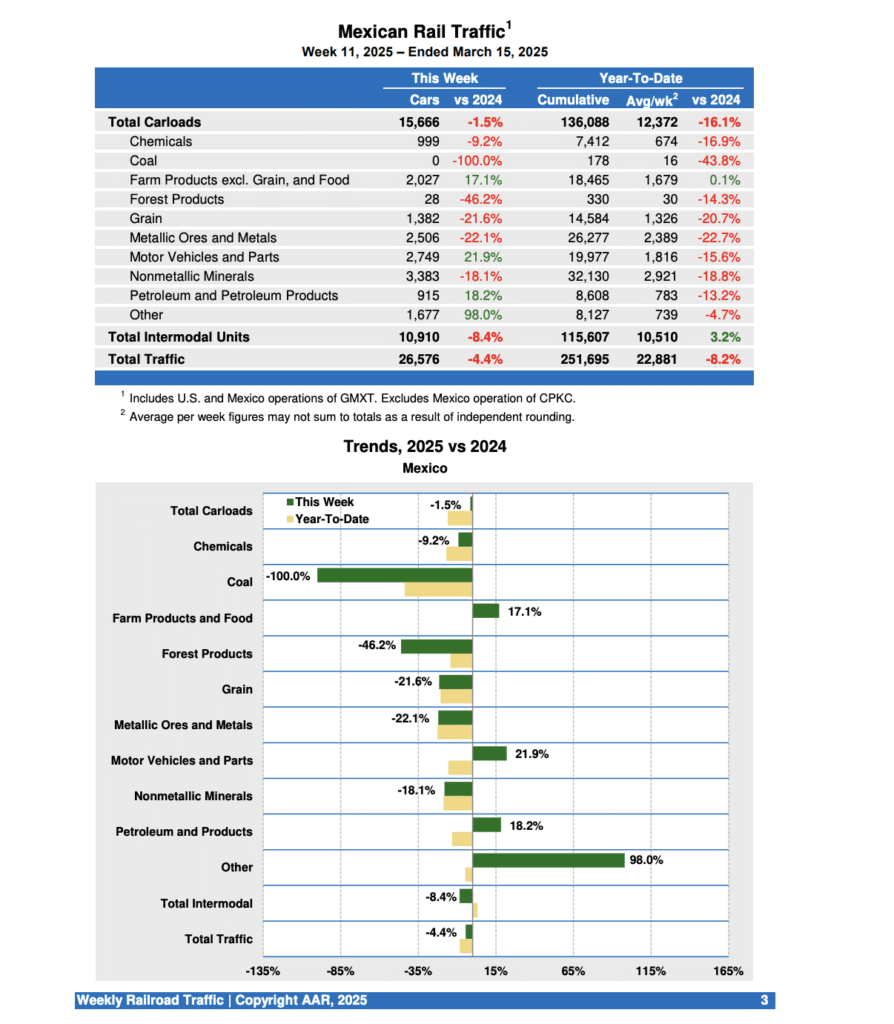For the week ending March 15, 2025, Mexican railroads reported 15,666 carloads, a 1.5% drop-off, and 10,910 intermodal units, an 8.4% dip from the same point last year. Their cumulative volume for the first 11 weeks of 2025 came in at 251,695 carloads and intermodal containers and trailers, decreasing 8.2% from year-ago period.