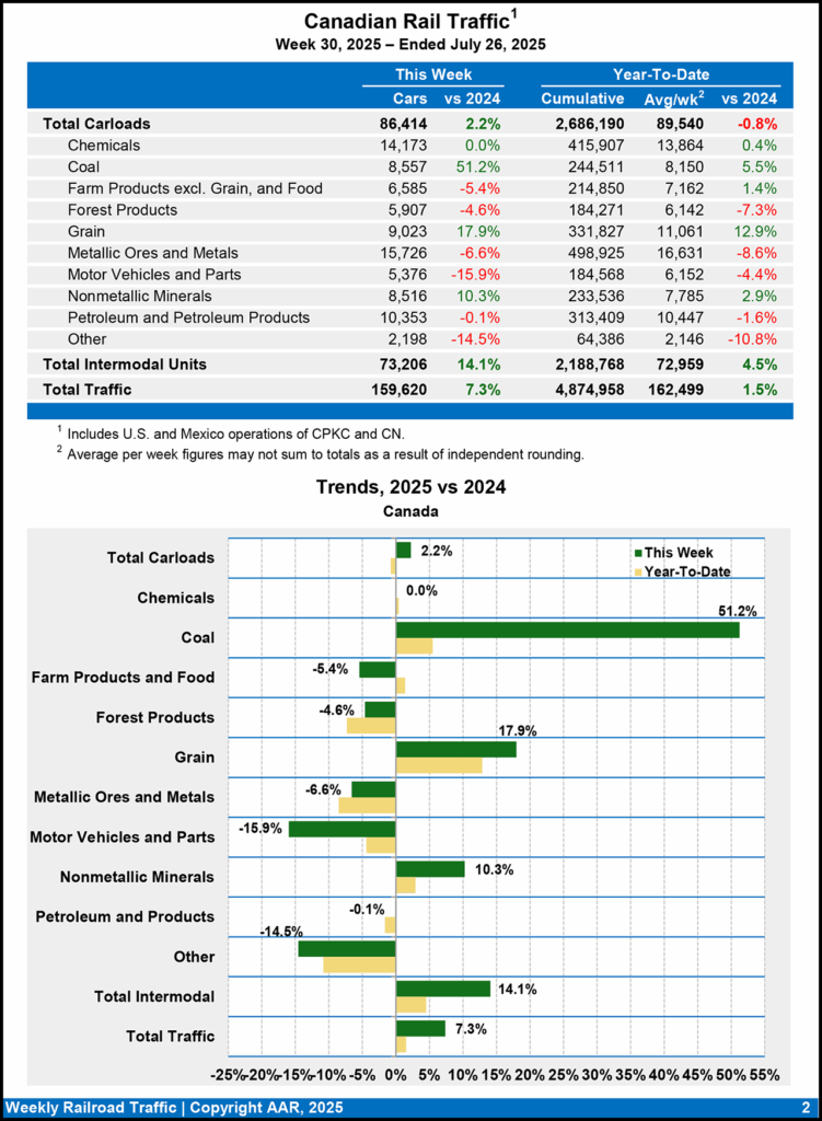 Canadian railroads reported 86,414 carloads for the week ending July 26, 2025, up 2.2%, and 73,206 intermodal units, up 14.1% from the same point last year. For the first 30 weeks of 2025, they reported cumulative rail traffic volume of 4,874,958 carloads, containers and trailers, a 1.5% increase.