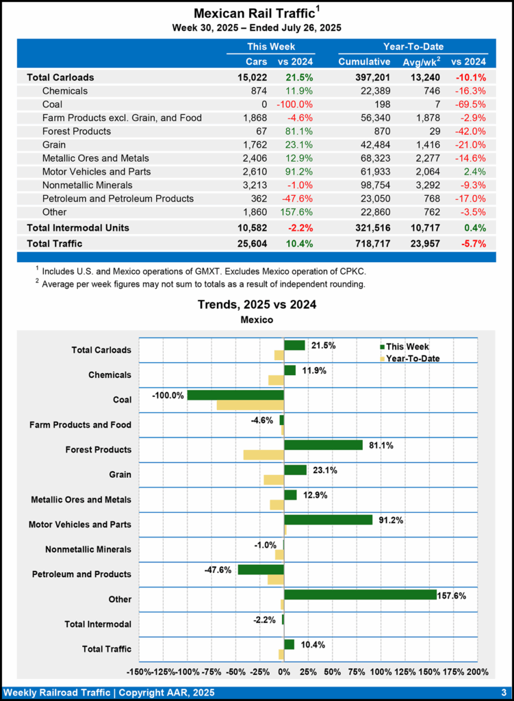 Mexican railroads reported 15,022 carloads for the week ending July 26, 2025, rising 21.5% from the year-ago period, and 10,582 intermodal units, dipping 2.2%. Their cumulative volume for the first 30 weeks of 2025 came in at 718,717 carloads and intermodal containers and trailers, a 5.7% drop-off from the same point last year.